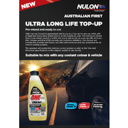 Note: The life of Nulon ONE Top-Up Coolant defaults to that of the original coolant in the cooling system. If you are unaware of the type or life of the coolant in the system we recommend a complete coolant change within the next 5,000km or 6 months to the appropriate Nulon Premium Long Life Concentrated Coolant or ONE Coolant.